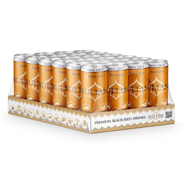 Heerlijke frisdrank met extract van habba sawda (Çörek otu, zwartzaad), verse curcuma, mango en uiteraard sinasappel en mandarijn.